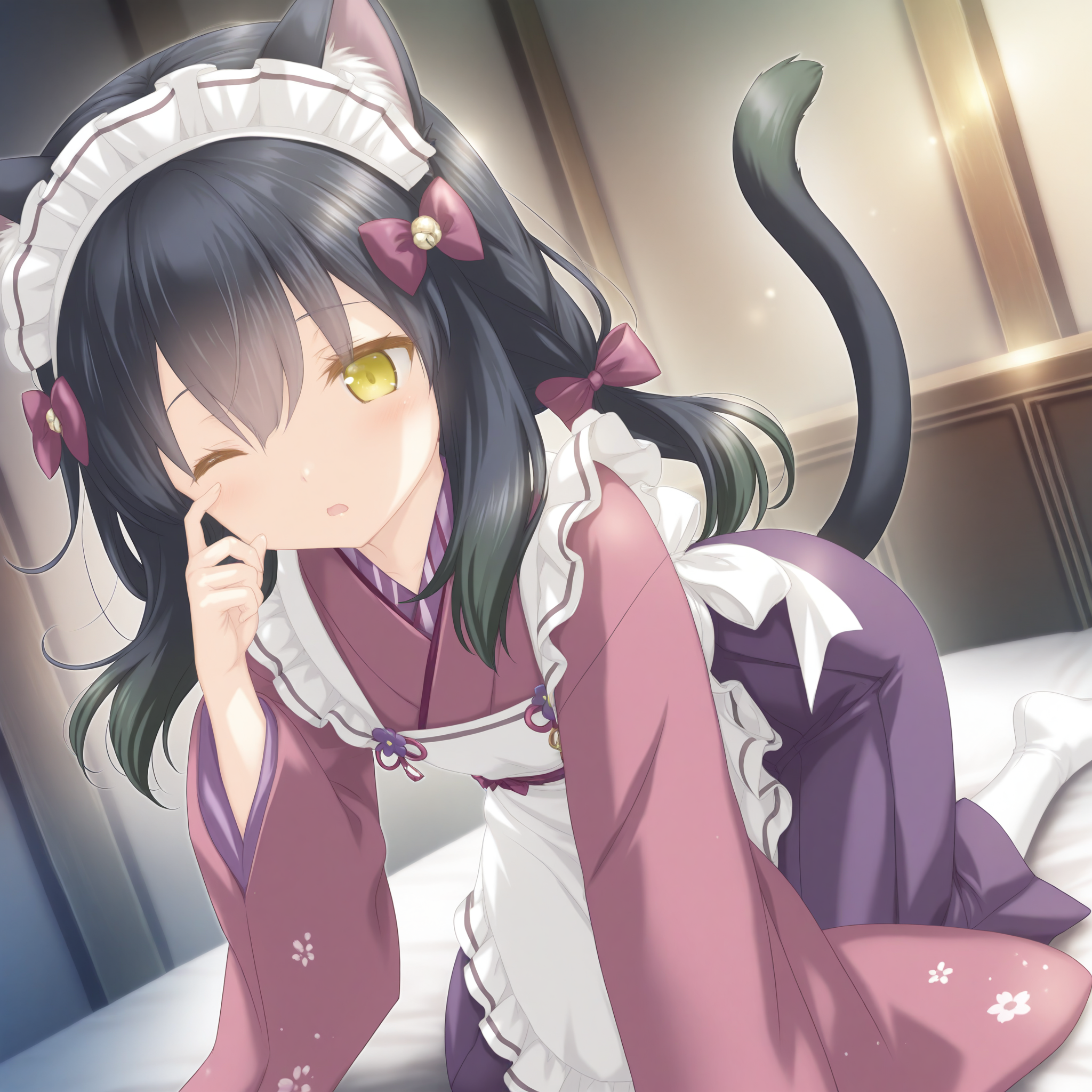 low twintails,hair bow,maid,japanese clothes,maid headdress,wa maid,kimono,bow,long sleeves,hakama,hakama skirt,wide sleeves,maid apron,white apron,floral print,