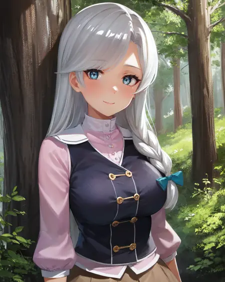 <lora:Diana-000008:0.8>, Diana, 長い髪, 灰色の髪, 片方の編み込み, 片肩に髪を垂らす, 髪のリボン, 青い目, 大きな胸,