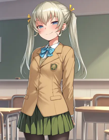 她平时的装扮:棕色夹克、绿色百褶裙、蓝色领结、连裤袜。