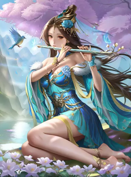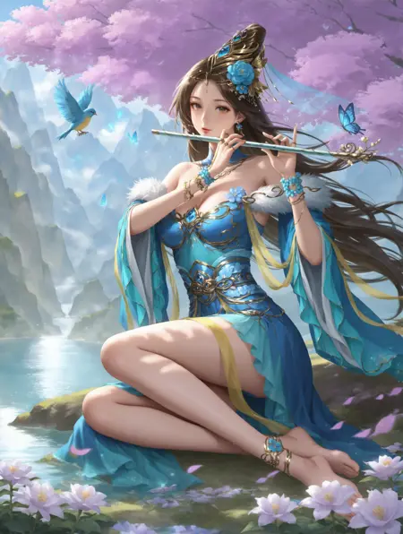 1girl,anklet,barefoot,bird,bracelet,brown hair,butterfly,dress,earrings,flower,flute,hair flower,hair ornament,instrument,jewelry,long hair,mountain,playing instrument,sitting,solo,