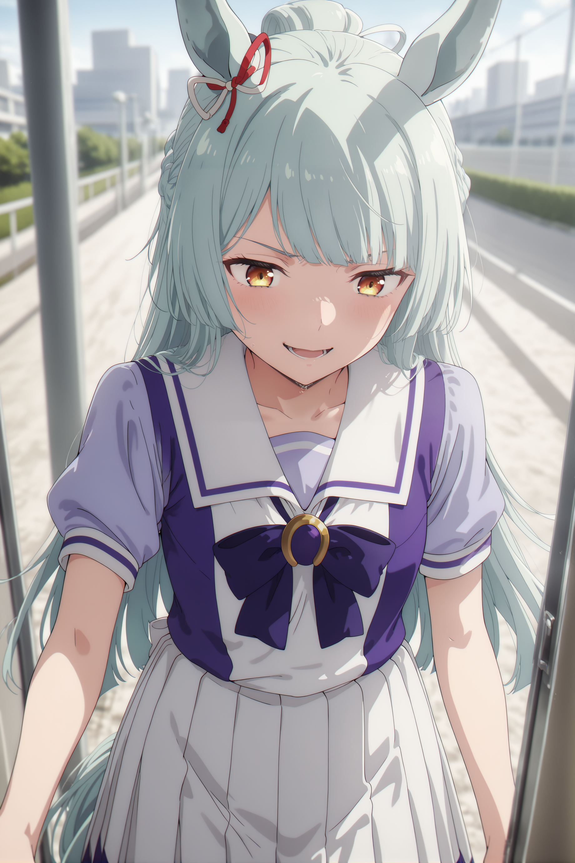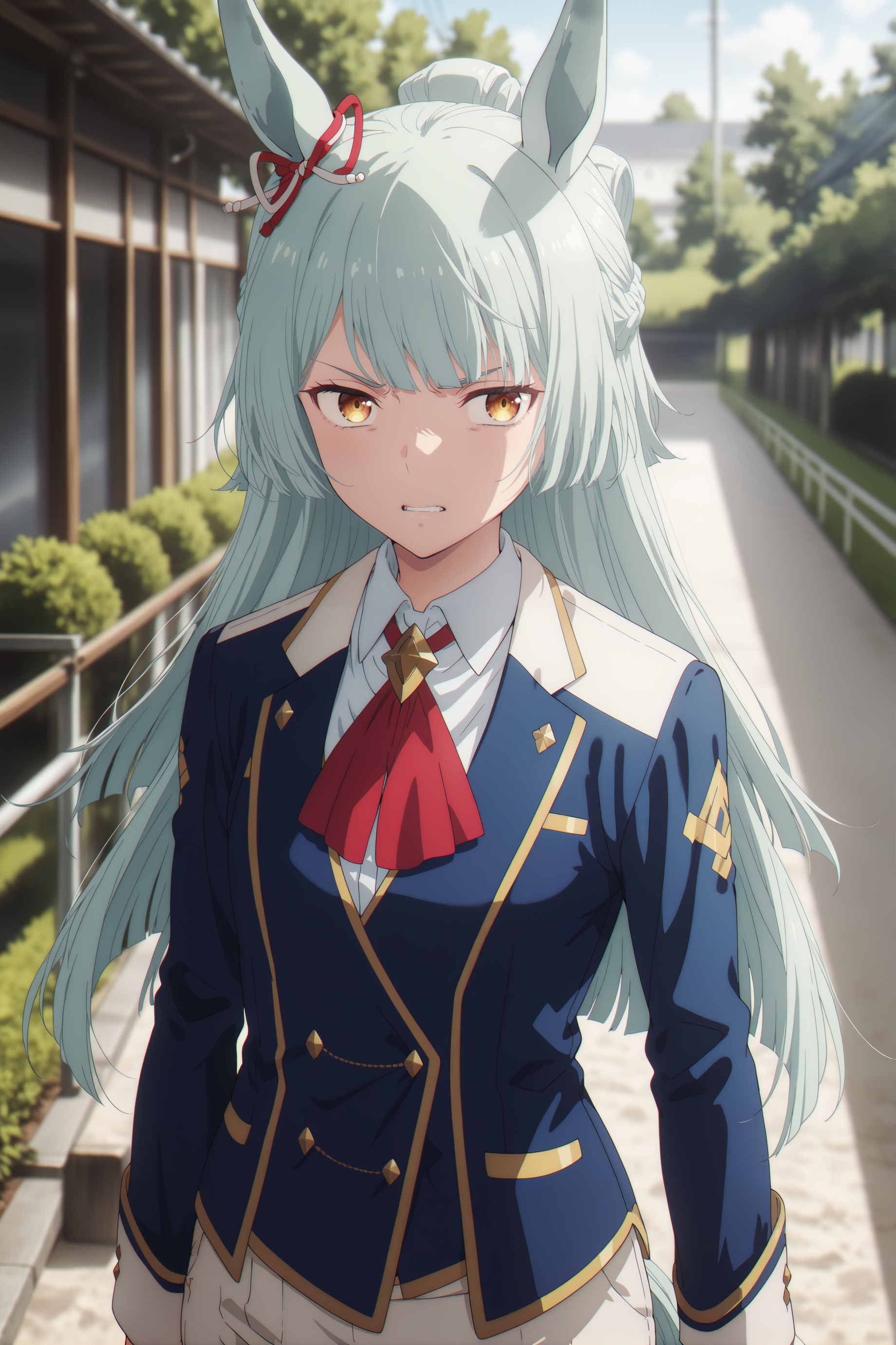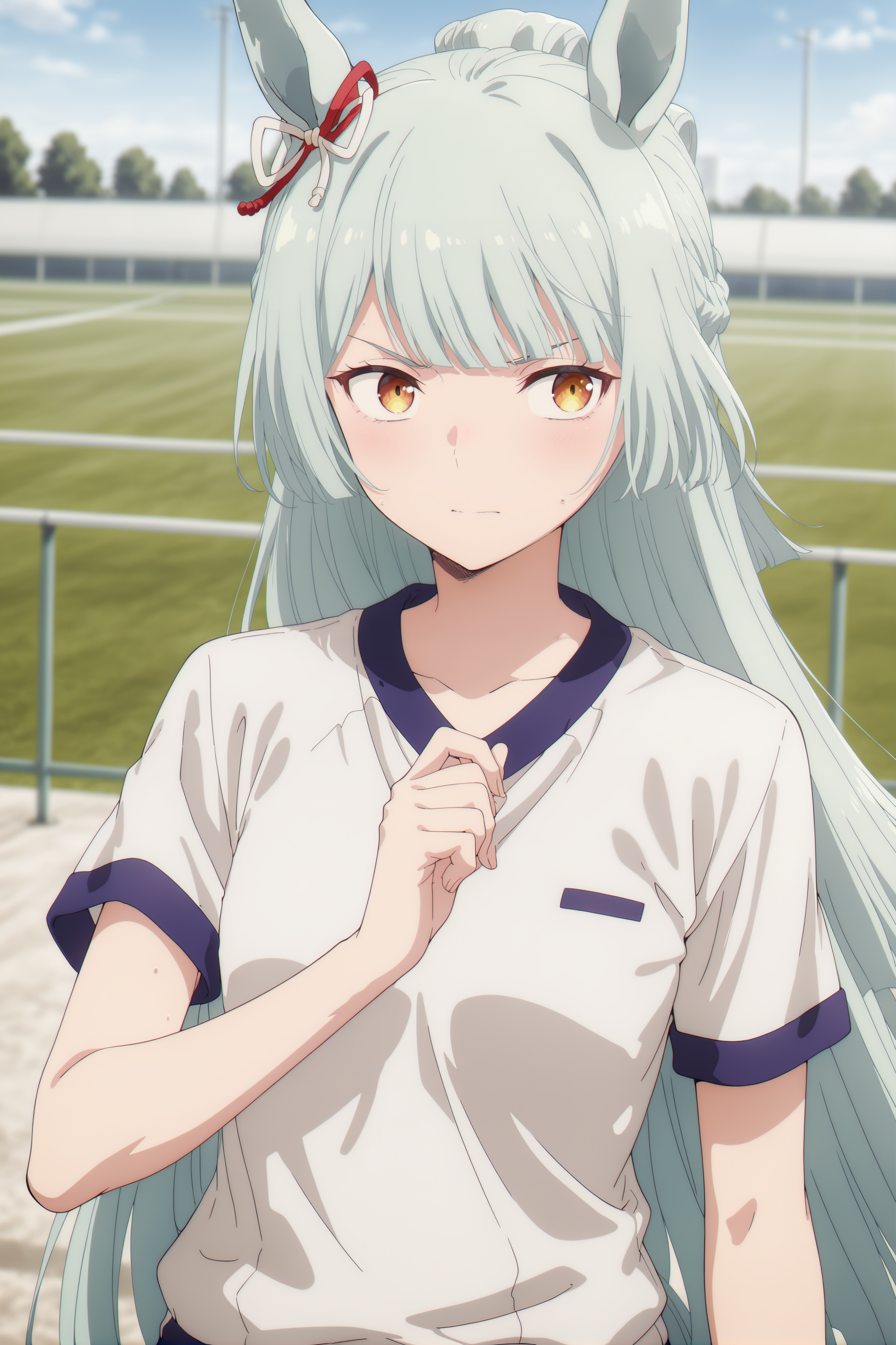 とりあえずお守りとして… umamusume, animal ears, horse ears, horse girl, solo, brown eyes, aqua hair, long hair, blunt bangs, braid, ear ribbon に加え、small breasts と flat chest はお好みで選んでください。断髪後は long hair の代わりに bob cut, short hair を使用してください。