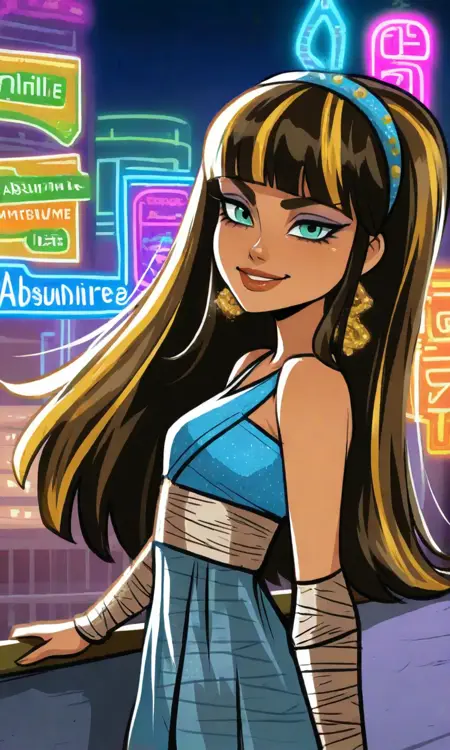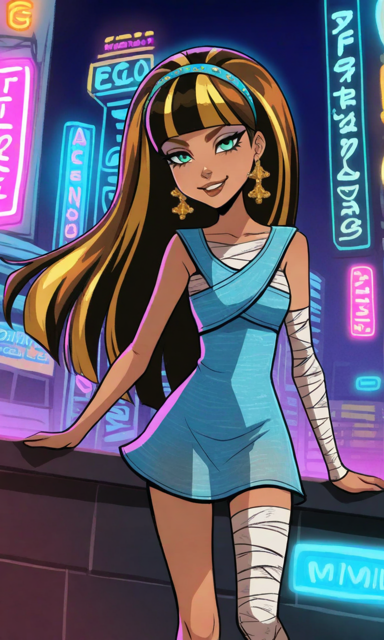 Cleo_DeNile_SING, black hair with blonde highlights:2.1, brown hair, long hair, three-tone hair, blue dress, mummy dress