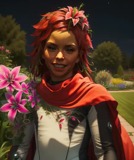 PoisonIvy, red hair, green eyes, - braid, - braid over shoulder,