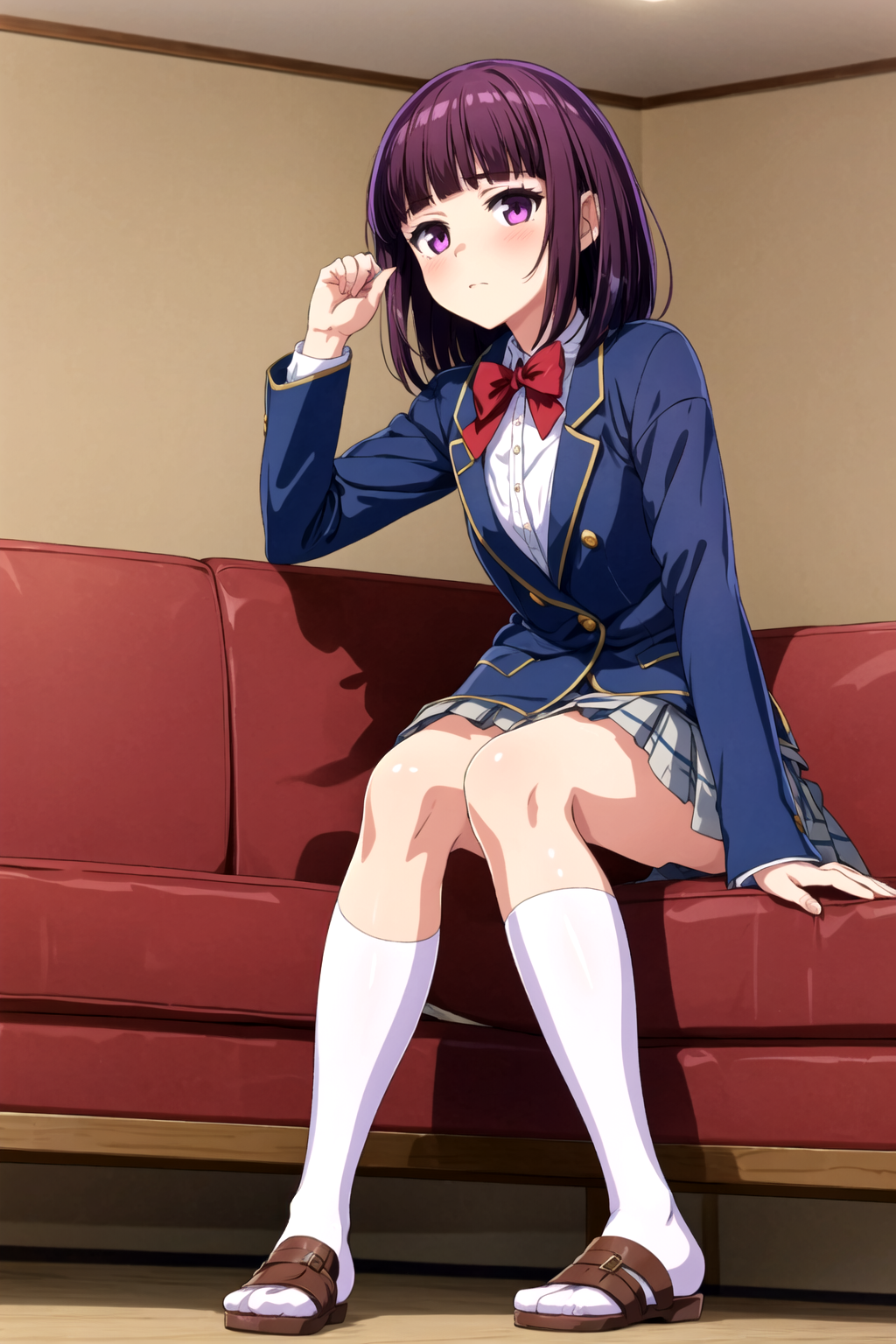 ・MGCM school uniform(校服,蓝色夹克,长袖,袖子过腕,红色蝴蝶结,臂章,百褶裙,白色过膝袜,凉鞋)