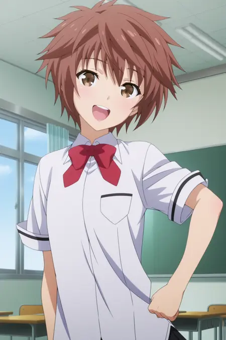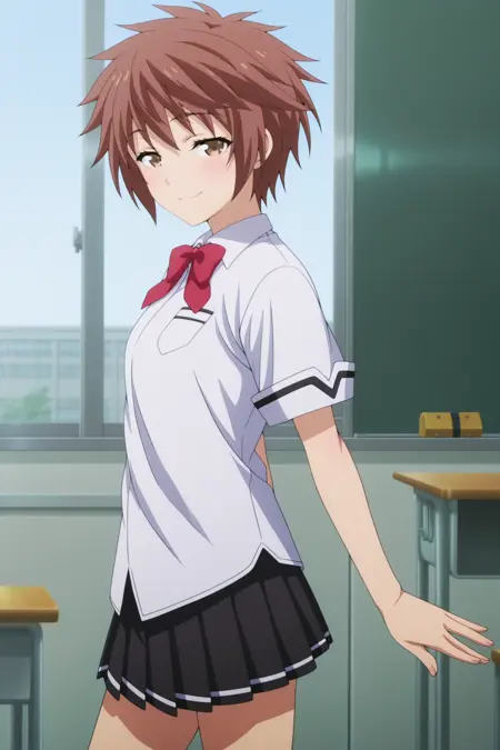 kobayakawa yuuka, short hair, brown hair, short sleeves, white shirt, collared shirt, untucked shirt, red bowtie, black skirt, pleated skirt, white socks, kneehighs, black footwear, loafers
