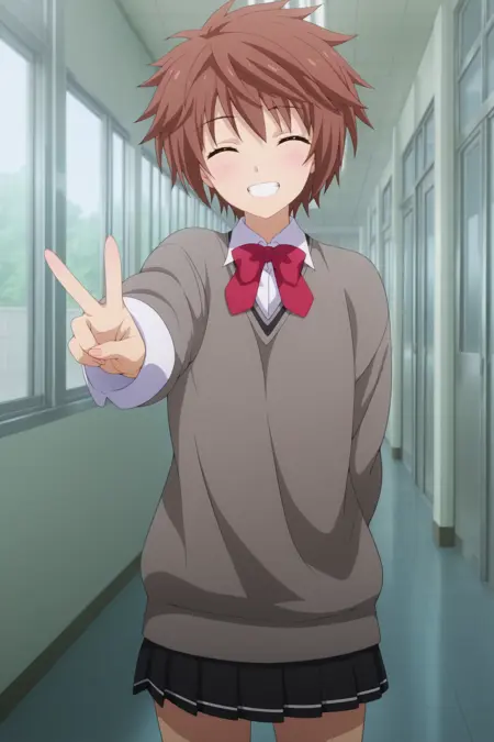 kobayakawa yuuka, short hair, brown hair, long sleeves, grey sweater, white shirt, collared shirt, sleeve cuffs, red bowtie, black skirt, pleated skirt, black socks, kneehighs, black footwear, loafers