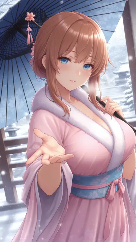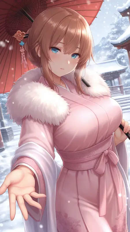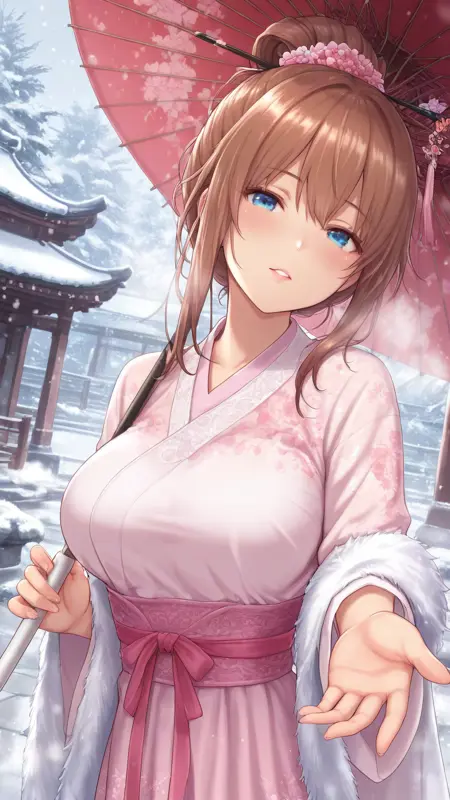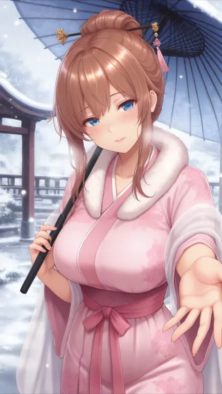 hibikiamane,1girl,brown hair,multicolored_hair,(pink hair:0.6), large breasts,low ponytail, hair bow pink bow,very long braid ponytail,