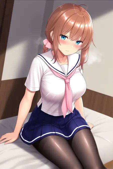 , hibikiamane,1girl, blue eyes,large breasts, brown hair, pink hair bow,low long braid ponytail, blue skirt, white school uniform, serafuku, pleated skirt, neckerchief, short sleeves, pink neckerchief, white sailor collar, black pantyhose,