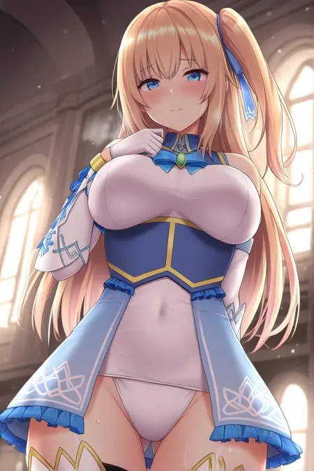 , Celesphonia, blonde hair, blue eyes, straight hair, long hair, one_side_up, 1girl, large breasts, white gloves, elbow gloves, covered navel, bare shoulders, white thighhighs,