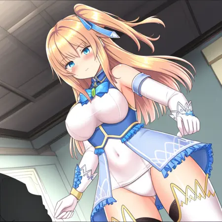 , Celesphonia, blonde hair, blue eyes, straight hair, long hair, one_side_up, 1girl, large breasts, white gloves, elbow gloves, covered navel, bare shoulders, white thighhighs,