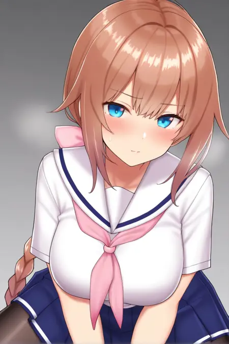 , hibikiamane,1girl, blue eyes,large breasts, brown hair, pink hair bow,low long braid ponytail, blue skirt, white school uniform, serafuku, pleated skirt, neckerchief, short sleeves, pink neckerchief, white sailor collar, black pantyhose,