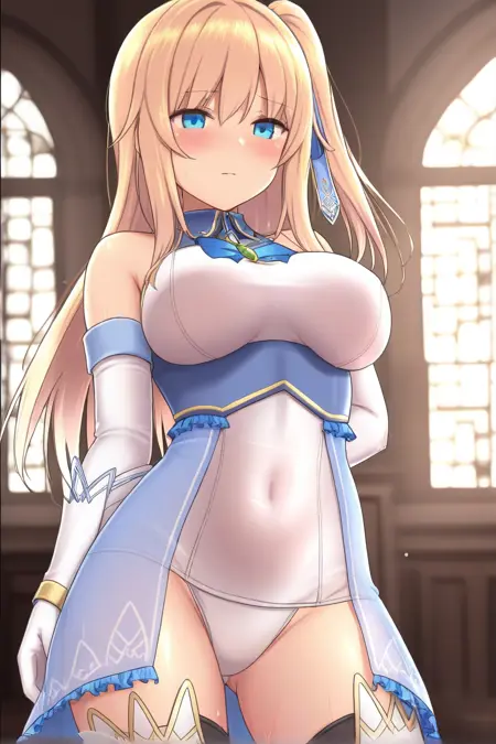 , Celesphonia, blonde hair, blue eyes, straight hair, long hair, one_side_up, 1girl, large breasts, white gloves, elbow gloves, covered navel, bare shoulders, white thighhighs,