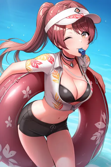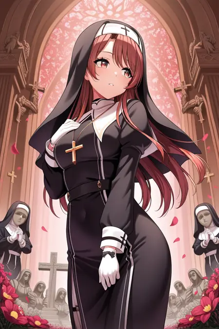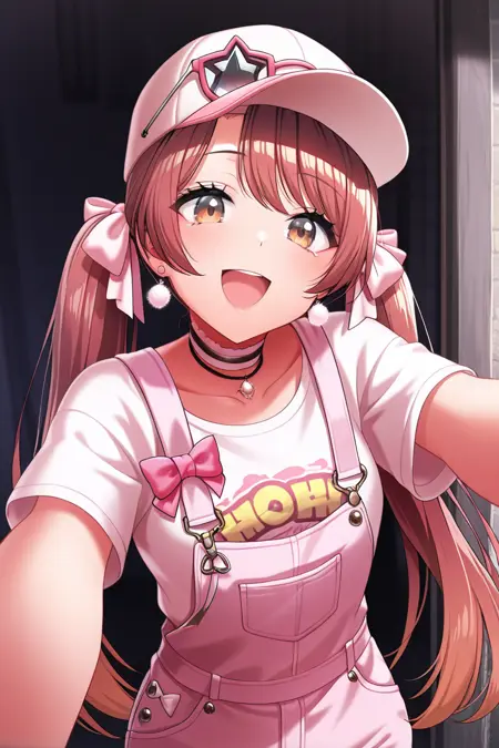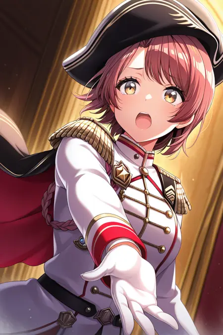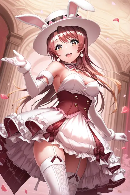 haruna, 1girl, solo, skirt, gloves, hat, long hair, smile, beret, shirt, long sleeves, suspenders, blush, yellow eyes, black headwear, red hair, :d, casual