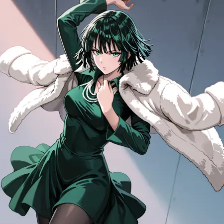 • 带外套的触发词:FubukiCoat, fubuki (one-punch man), 1girl, green eyes, green dress, jewelry, necklace, short hair, black hair, medium breasts, fur coat, pantyhose, jacket on shoulders, long sleeves, bangs, cowboy shot