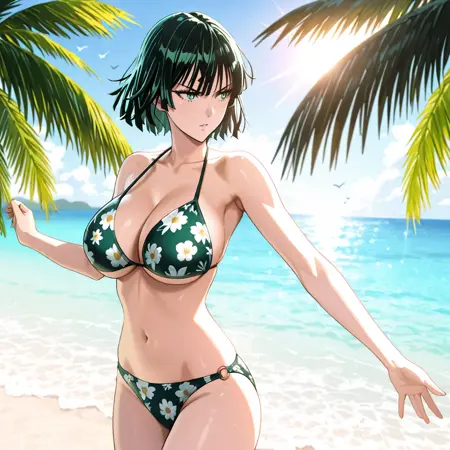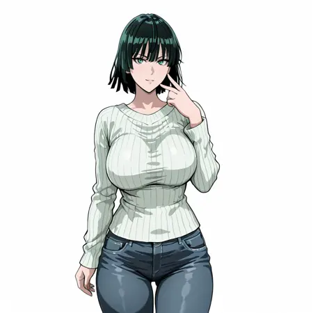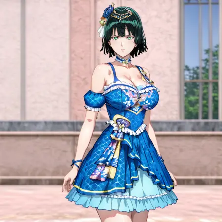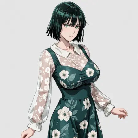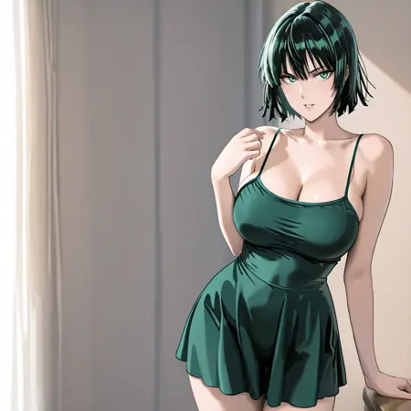 • 触发词:Fubuki, 1girl, fubuki (one-punch man), green dress, black hair, short hair, large breasts, green eyes, bangs, long sleeves, necklace, jewelry, collarbone, collared dress, cowboy shot