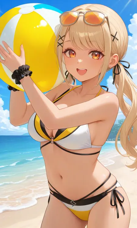 kaminari qpi, qpi aasummer2023, long hair, x hair ornament, low twintails, hair ribbon, two-tone bikini, multi-strapped bikini bottom, sunglasses, orange-tinted eyewear, wrist scrunchie🌺 2024 夏季服装: