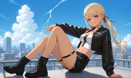 kaminari qpi, qpi default, long hair, low twintails, x hair ornament, hair ribbon, chain necklace, white tank top, navel, leather jacket, cropped jacket, black shorts, torn shorts, o-ring thigh strap鞋履提示词: