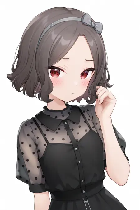 ebizuka tomo,1girl,red bow,red eyes,dress,collared dress,red bow,frilled dress,hair bow,black dress,short hair,belt buckle, hairband,