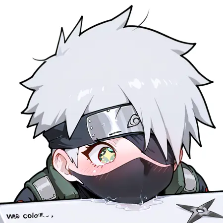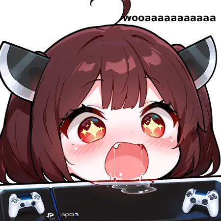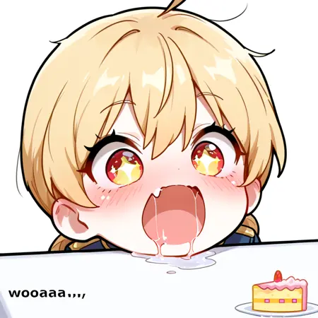 woahpipebomb, chibi, ${你喜爱的物品} 在桌上, 张开嘴, 脸红, 流口水, 尖牙, 英文文字,
