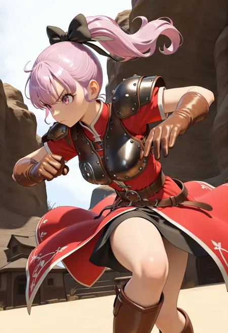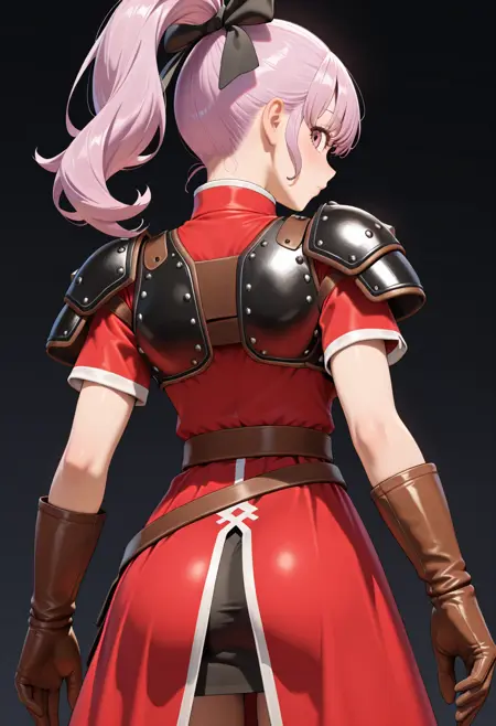 hair bow, shoulder armor, breastplate, red dress, short sleeves, brown gloves, leather gloves, belt, skirt, knee boots