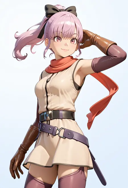 hair bow, scarf, short dress, gloves, leather gloves, belt, thighhighs, knee boots