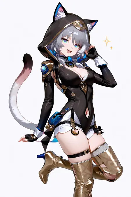 暗号 \(ホンカイ・スター・レール\)、1人-girl、単独、尾、グレーの髪、青い目、手袋、動物の耳、フード、猫の尾、猫の耳、フードをかぶった状態、黒い手袋、指なし手袋、猫娘、動物用フード、ショートパンツ、胸元の露出、編み髪、猫用フード、長袖、太ももハイ、太ももストラップ、中くらいの髪の長さ、服の切り抜き、胸元の切り抜き