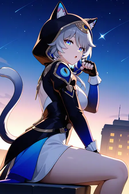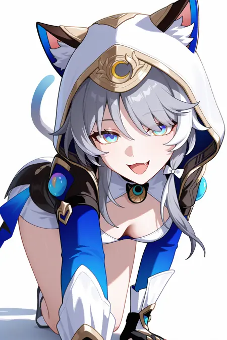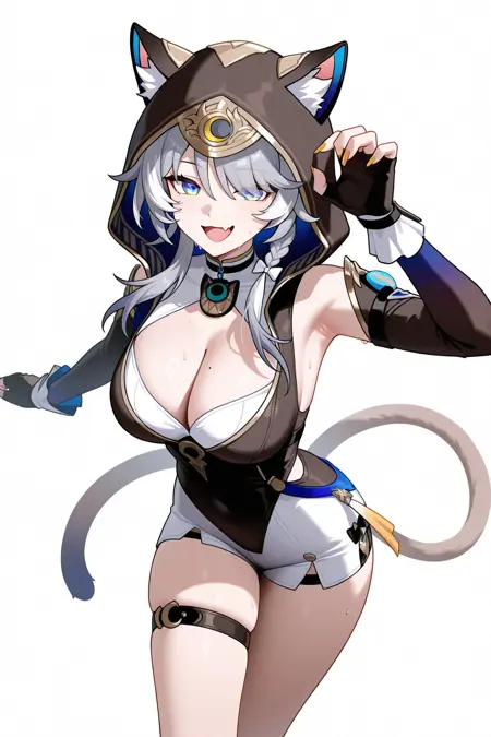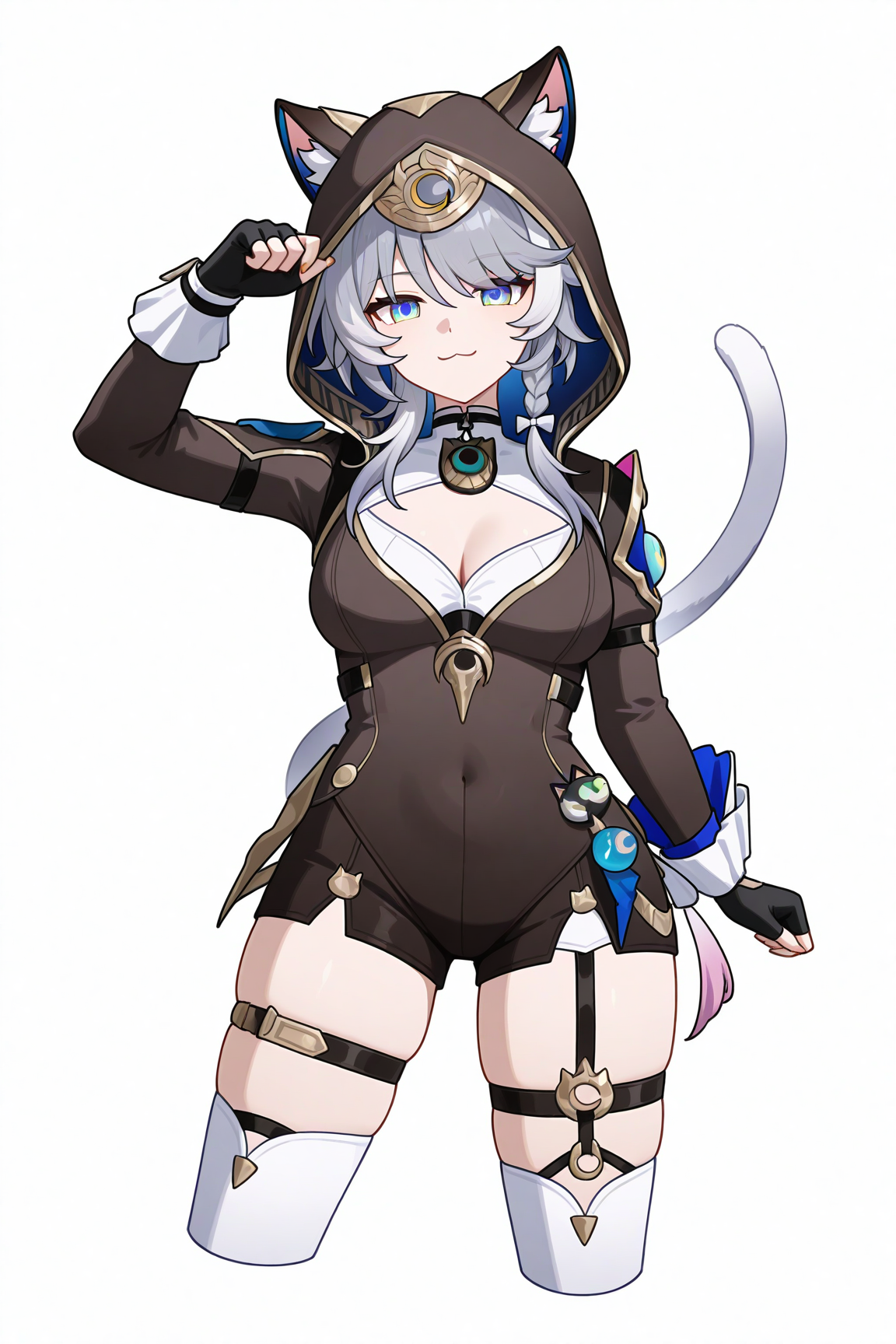 暗号 \(ホンカイ・スター・レール\)、1人-girl、単独、尾、グレーの髪、青い目、手袋、動物の耳、フード、猫の尾、猫の耳、フードをかぶった状態、黒い手袋、指なし手袋、猫娘、動物用フード、ショートパンツ、胸元の露出、編み髪、猫用フード、長袖、太ももハイ、太ももストラップ、中くらいの髪の長さ、服の切り抜き、胸元の切り抜き