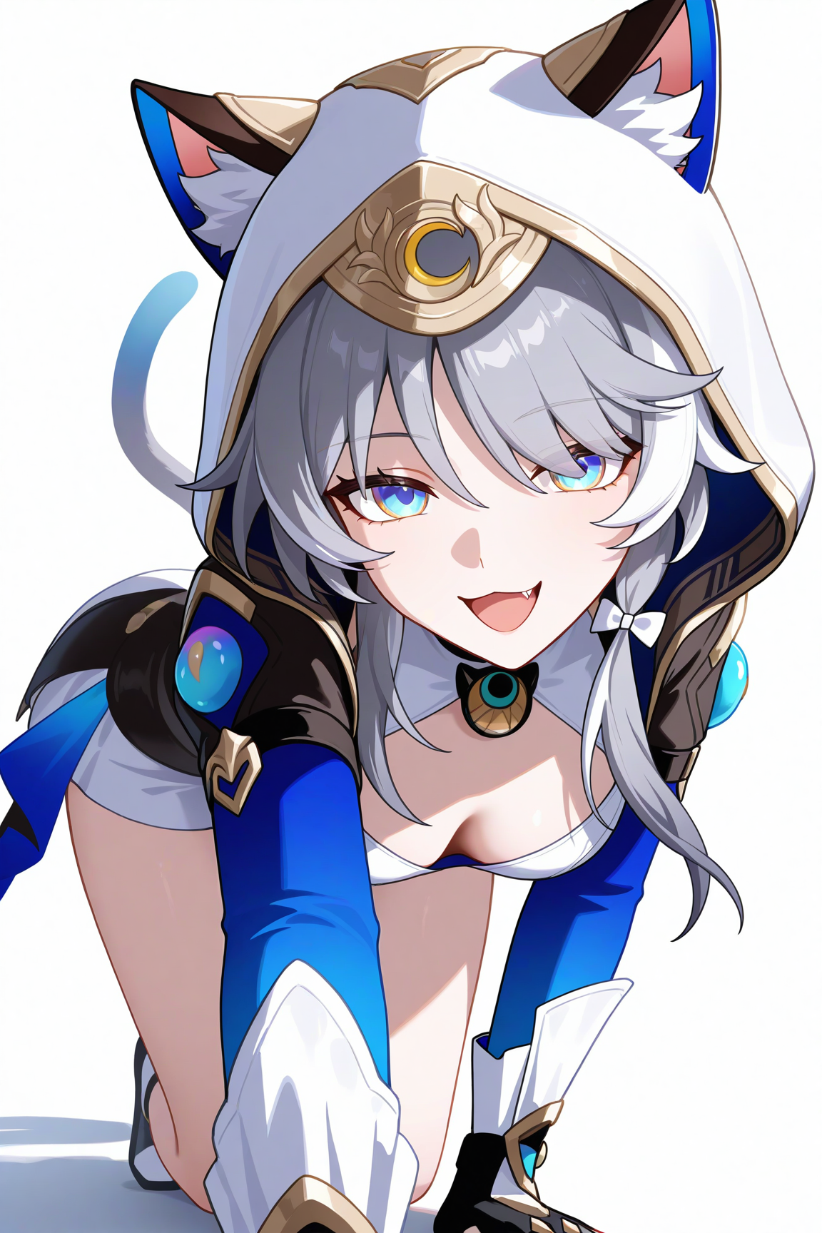 暗号 \(ホンカイ・スター・レール\)、1人-girl、グレーの髪、青い目、フード、尾、胸元のほくろ、動物の耳、猫の耳、服の切り抜き、動物用フード、編み髪、猫用フード、胸元の切り抜き