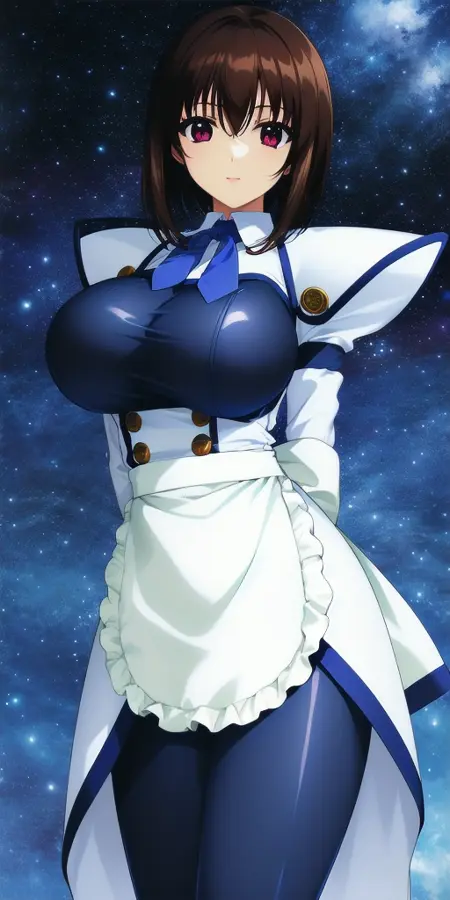 White_dress_overskirt_thighs_black_pantyhose_black_shirt_underbust_shoulder_pads_blue_cross_tie_buttons_white_back_bow:エプロンなしバージョンは不安定かもしれません。