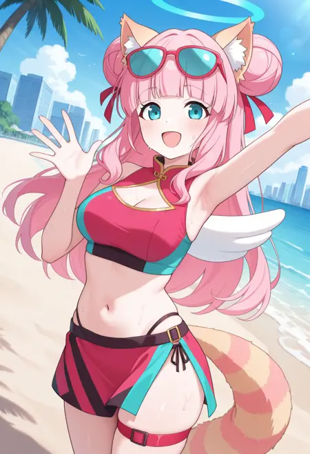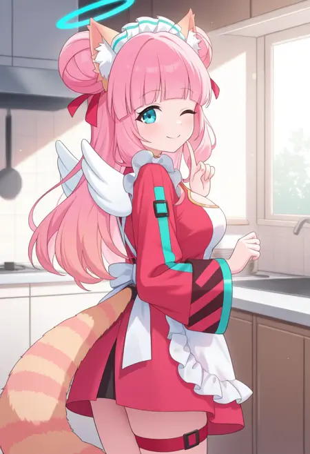 blue halo, blue eyes, long hair, blunt bangs, pink hair, hair bun, hair ribbon, double bun, animal ears, wings, tail,