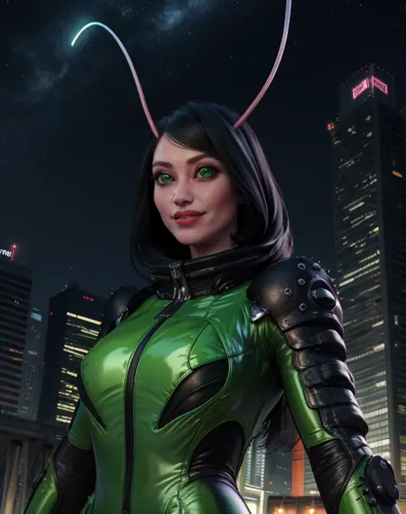 mantisG, 검은 머리, 녹색 눈, 씨 antennae,