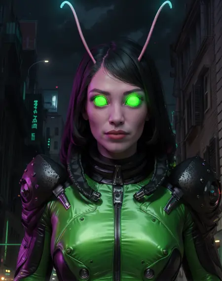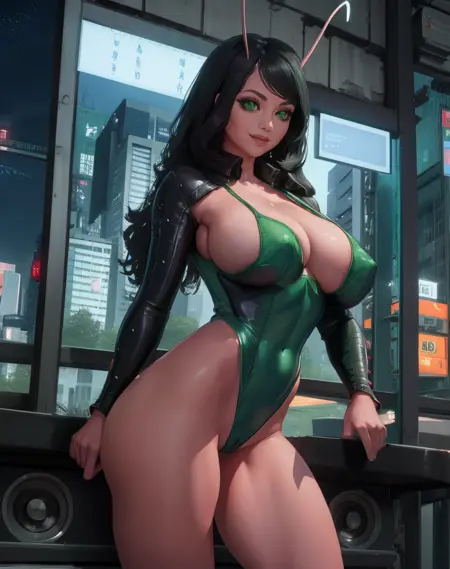 mantisG, black hair, green eyes, antennae,