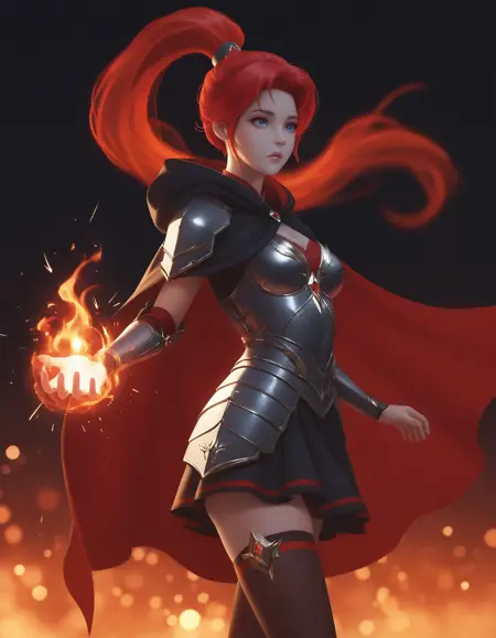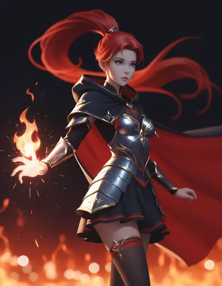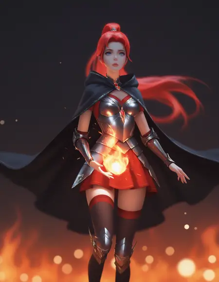 装甲ドレス、赤いカーペット、手袋、鎧、スカート、肘まで続く手袋、胸元の切り抜き、胸板、肩甲部の装甲、太ももまで届く靴下、