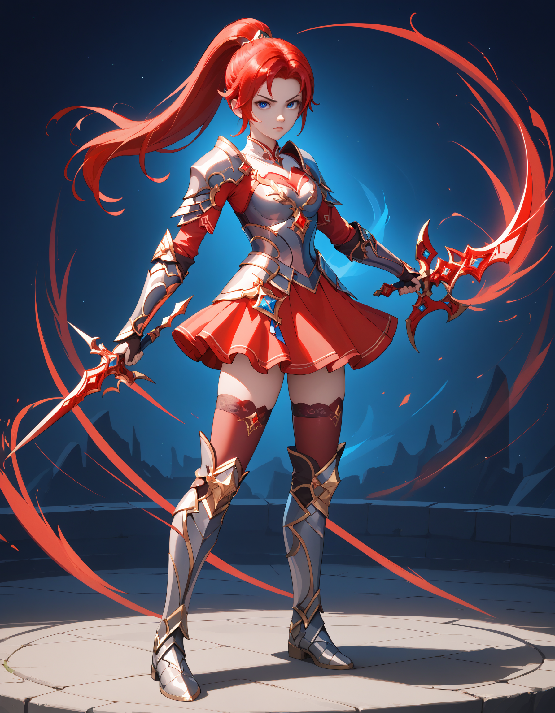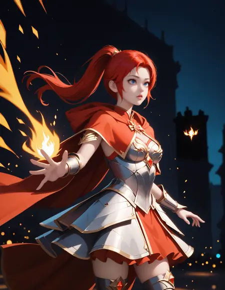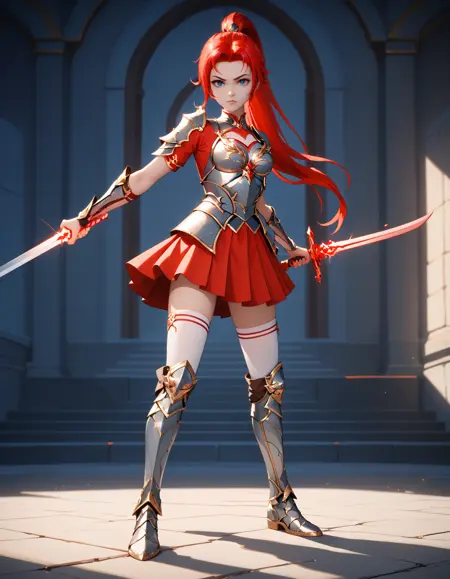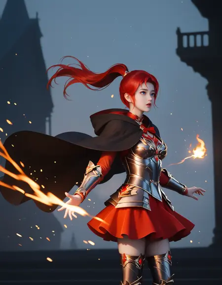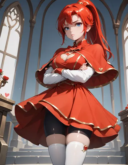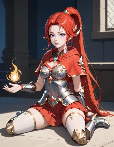装甲ドレス、赤いカーペット、手袋、鎧、スカート、肘まで続く手袋、胸元の切り抜き、胸板、肩甲部の装甲、太ももまで届く靴下、
