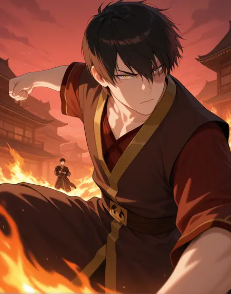 Zuko: zuko, red shirt, brown robe, gold trim, red pants, 1boy, yellow eyes