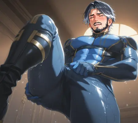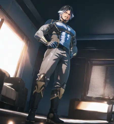 1boy,beard,black hair,facial hair,male focus,multicolored hair,muscular,bodysuit,pants,boots,mustache,