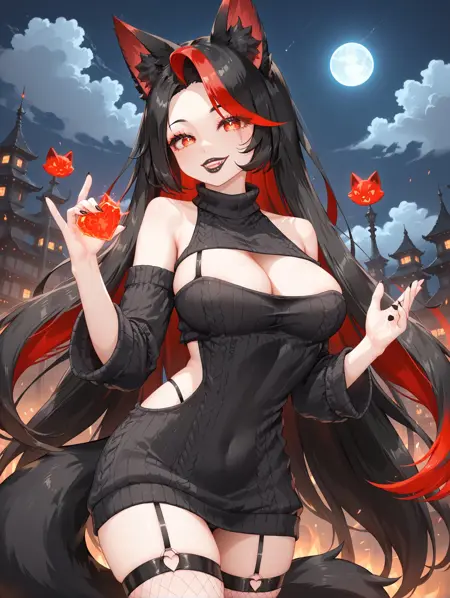 Suki,VTuber,Red Hair Streak,Black hair,Kitsune,Fox Tail,Fox Ears,Scar over right eye,Red Eyes,Asymetrical pants,Sports Bra