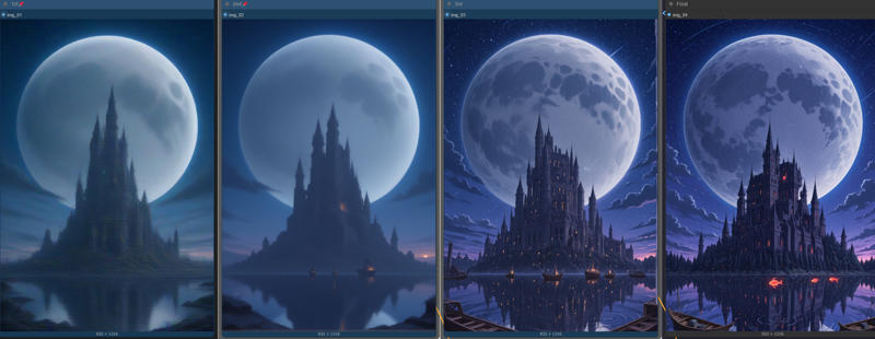 - 在第2步中,对第1步的构图进行轮廓化处理,同时保持细节模糊(让第3步由 AI 补充细节)。