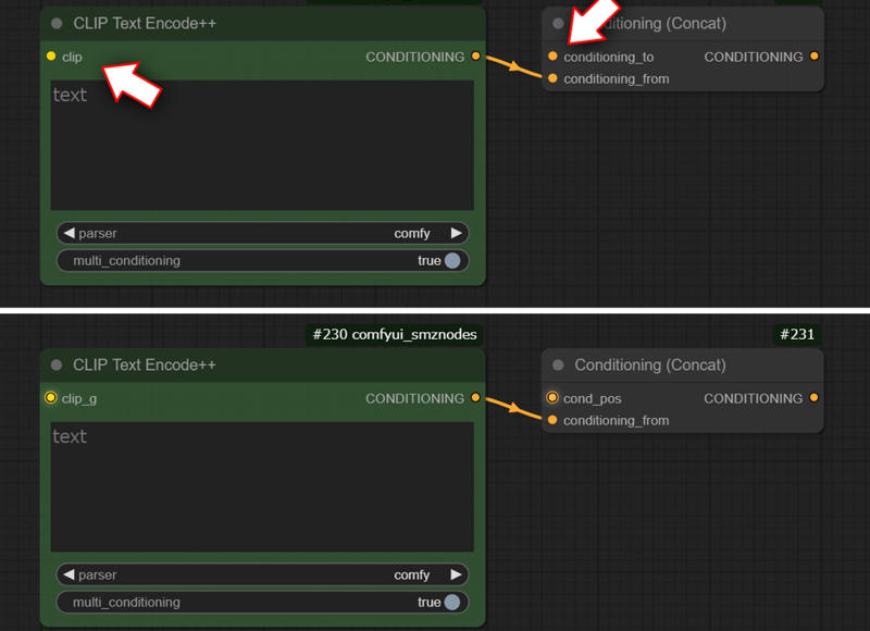 准备“CLIP Text Encode”和“Conditioning(Concat)”节点,并按如下方式连接和重命名: