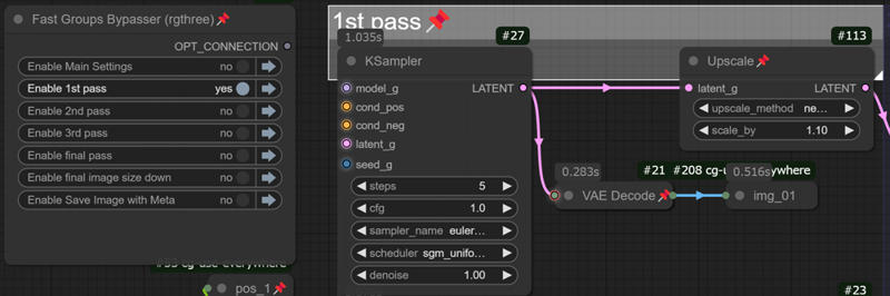 建议多次尝试,比较采样器和调度器对提示词的影响程度。若已熟悉其效果,可固定种子值,并取消第2步的旁路以继续。