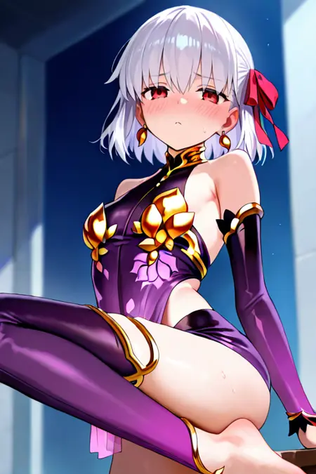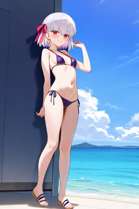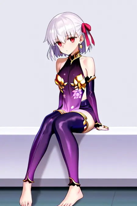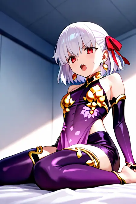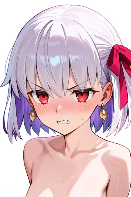 1girl, solo, kama_(fate), 短髪, 白髪, ヘアリボン, 赤い目, ピアス,