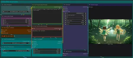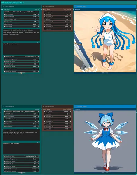 Regional Prompting과 ControlNet 결합: 이 경우 문자열 박스를 지역 프롬프트의 마스크 영역으로 사용하였고, 별도로 문자열 이미지를 사용해 각 지역 프롬프트에 ControlNet을 적용했습니다. ControlNet의 강도를 낮추어 자세와 배치만 유사하게 유지했습니다. 기본으로 생성한 동일한 문자열을 사용했으며, 별도의 LoRA를 적용하였지만, 다른 문자열로도 충분히 작동합니다.