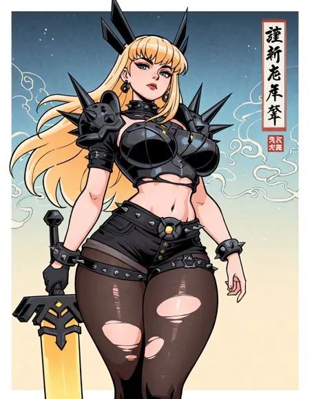 | Trained Words | Magik, long hair, blonde hair, blue eyes, breasts, thick thighs, hips, armor, chestplate, shoulder armor, shorts, torn pantyhose, navel, glove, spiked bracelet, earring, jewelry, holding sword, spiked, head wearCopied! Magik, long hair, blonde hair, blue eyes, big breasts, thick thighs, hips, chestplate, shoulder armor, navel, shorts, torn pantyhose, spikes, head wear, one glove, spiked bracelet, holding swordCopied! |