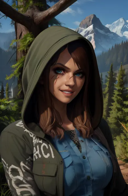 JessBlack, 蓝眼睛,棕色头发,脸上有疤痕,