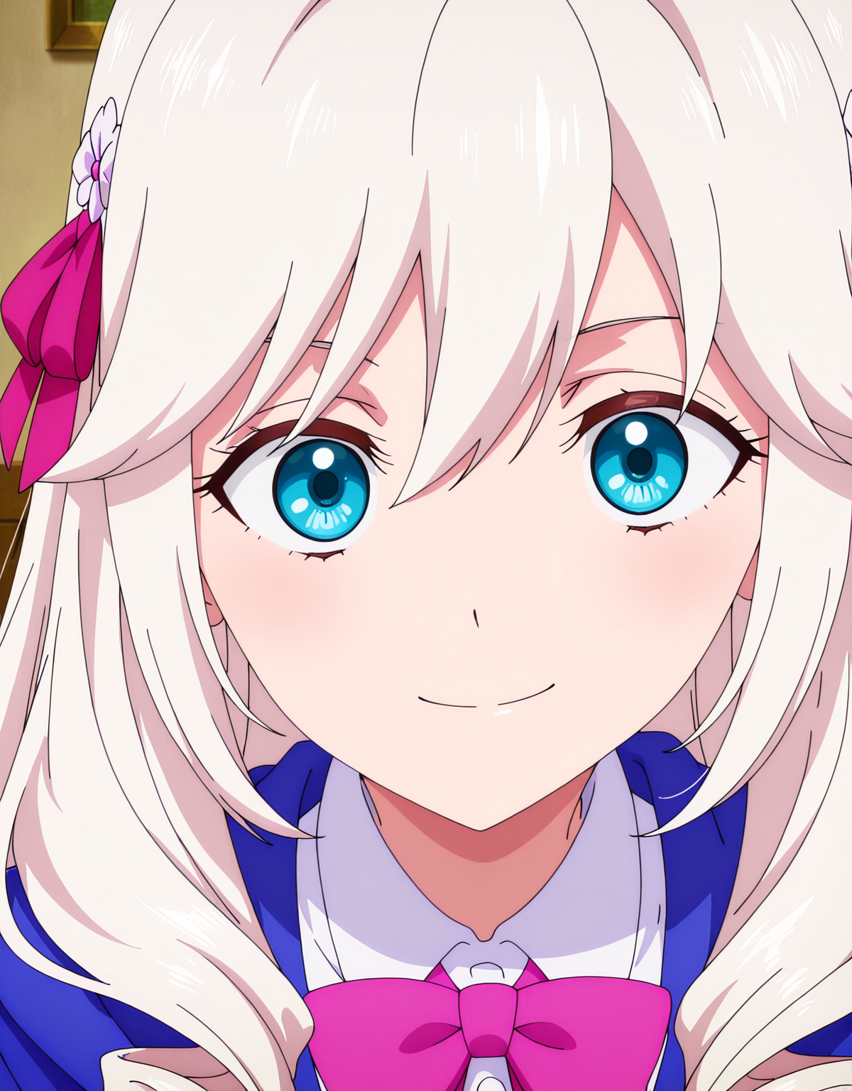 아리안, 흰색 머리카락, 앞치마 머리, 드릴 헤어, 눈 사이의 머리카락, 매우 긴 머리카락, 파란 눈, 머리 리본