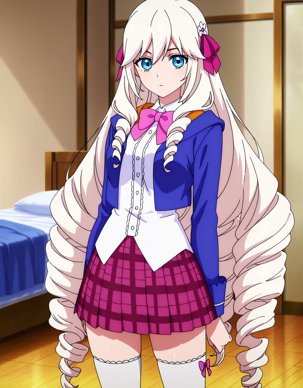 학교 유니폼, 파란색 재킷, 흰색 셔츠, 분홍색 리본, 체크무늬 치마, 흰색 허벅지 양말