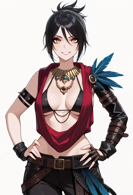Outfit: jewelry, necklace, red cloak, black bikini, bikini top only, black pants, fingerless gloves, single glove, feathers, armlet, belt, asymmetrical clothes, single sleeve