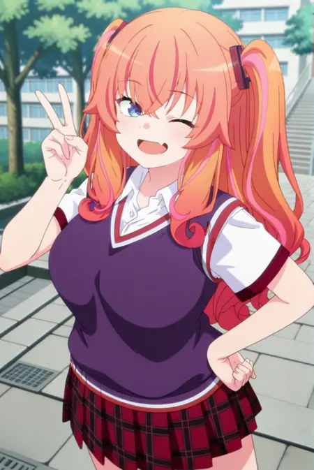<lora:Makina-IL-v1-08:0.85>, ChopioM4kina, long hair, orange hair, streaked hair, multicolored hair, gradient hair, two side up, sidelocks, red hair ornament, hair between eyes, crossed bangs, blue eyes, looking at viewer,