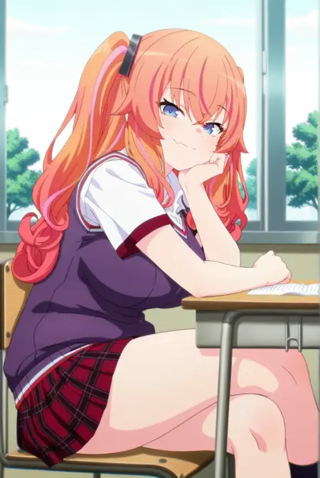 <lora:Makina-Pony-v1-07:0.8>, ChopioM4kina, long hair, orange hair, streaked hair, multicolored hair, gradient hair, two side up, sidelocks, red hair ornament, hair between eyes, crossed bangs, blue eyes, looking at viewer,