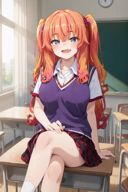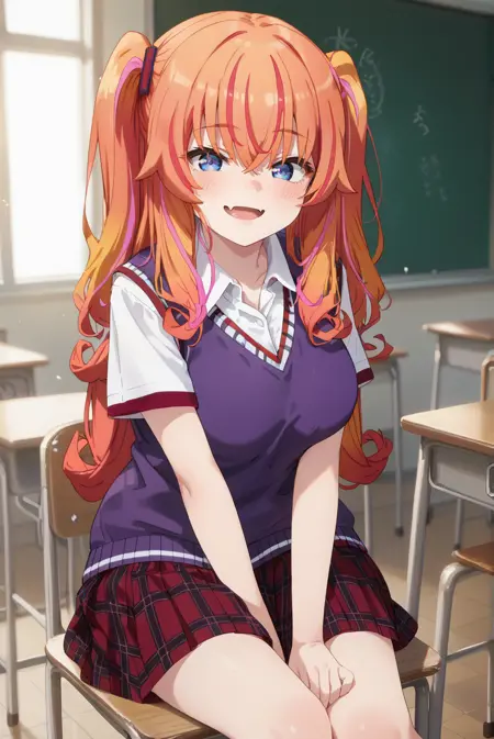 <lora:Makina-IL-v1-08:0.85>, ChopioM4kina, 긴 머리, 오렌지색 머리, 줄무늬 머리, 다색 머리, 그라데이션 머리, 양쪽 위로 땋은 머리, 옆머리, 빨간 머리 장식, 눈 사이의 머리, 교차된 앞머리, 파란 눈, 시청자 바라보기,